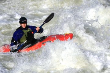 –.75 miles: the river splits. Take either side. The right channel offers some possibilities for practicing eddy turns. Depending on the water level either side could sport waves.