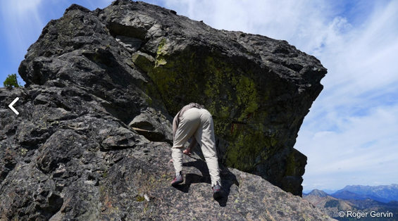 Armed with a bit of uncertainty, we headed up in the general direction of all three outcroppings… at first on loose scree… then onto a solid boulder field (where it became clear that the outcropping on the left (west) was our target)… then back on loose scree as we worked our way up to a notch on the east side of the Thimble… where we changed to rock climbing shoes for the final 60 feet of elevation gain to the summit (7080′).