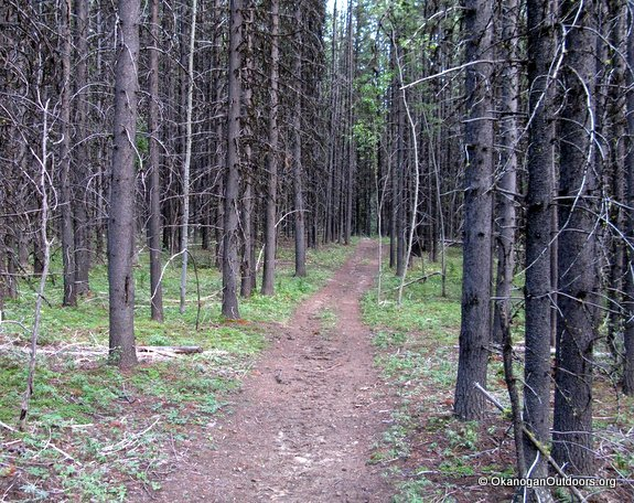Johnny Beall Short Loop. Once hikers have knocked-off the Chopaka Mountain Quad, with its alpine terrain, they might opt to complete this 6.6-mile forested loop for a contrasting experience. It’s far from spectacular but it is pleasantly forested and provides a number of nice views of Snowshoe Mountain and Goodenough Peak. This route is also a good trail run and horseback ride. Finally, as a mountain bike ride, consider nesting this loop inside the last ride by riding the Johnny Beall Long Loop in a clockwise direction, and then riding this loop in a counterclockwise direction.