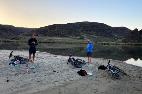 We set up our tent, cooked some dinner, dipped in the chilly river and tossed the disc around, all a great reward for a hard day of riding. Quilomene Bay is one of those places you see on a map that looks inviting until you realize you either need a boat or a 4×4 and lots of patience to get there so to be there under human power was sublime. The sandbar juts out into the Columbia and is shadowed by a large basalt cliff full of roosting birds. It was a pleasant and serene night.