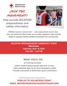 The American Red Cross is hosting a Wildfire Preparedness Community Event in Wenatchee on Saturday, April 18 from 9:00 AM to 2:00 PM, and we’re looking for volunteers to help us share simple, actionable preparedness information with nearby households.