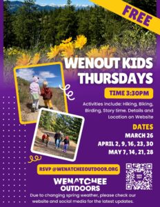Wenatchee Outdoors is looking forward to offering kids outings this spring each Thursday. Activities will include hiking, biking, birding, story time, and more. Details and locations will vary each week. Dates include: March 26, April 2, 9, 16, 23, 30, May 7, 14, 21, 28.