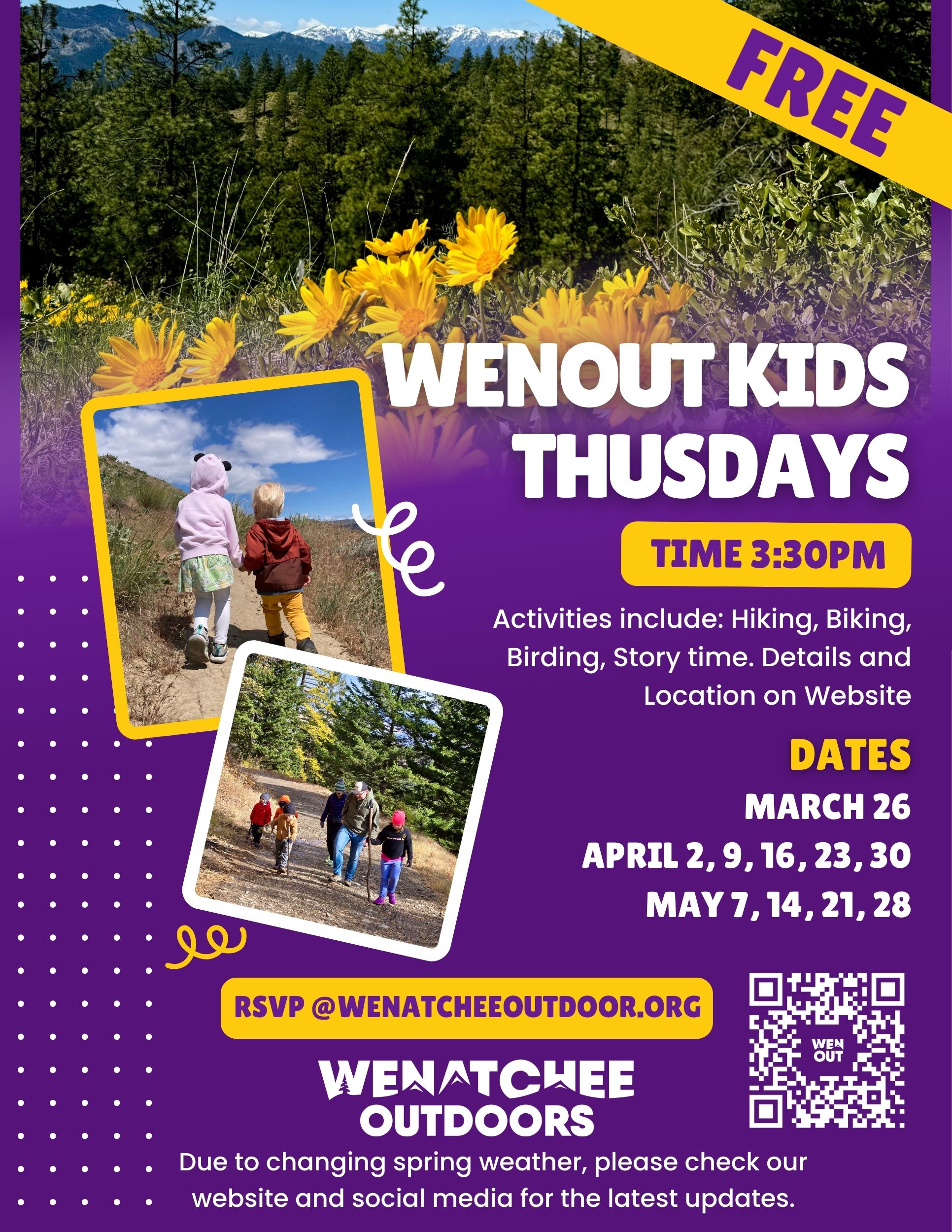 Wenatchee Outdoors is looking forward to offering kids outings this spring each Thursday. Activities will include hiking, biking, birding, story time, and more. Details and locations will vary each week. Dates include: March 26, April 2, 9, 16, 23, 30, May 7, 14, 21, 28.