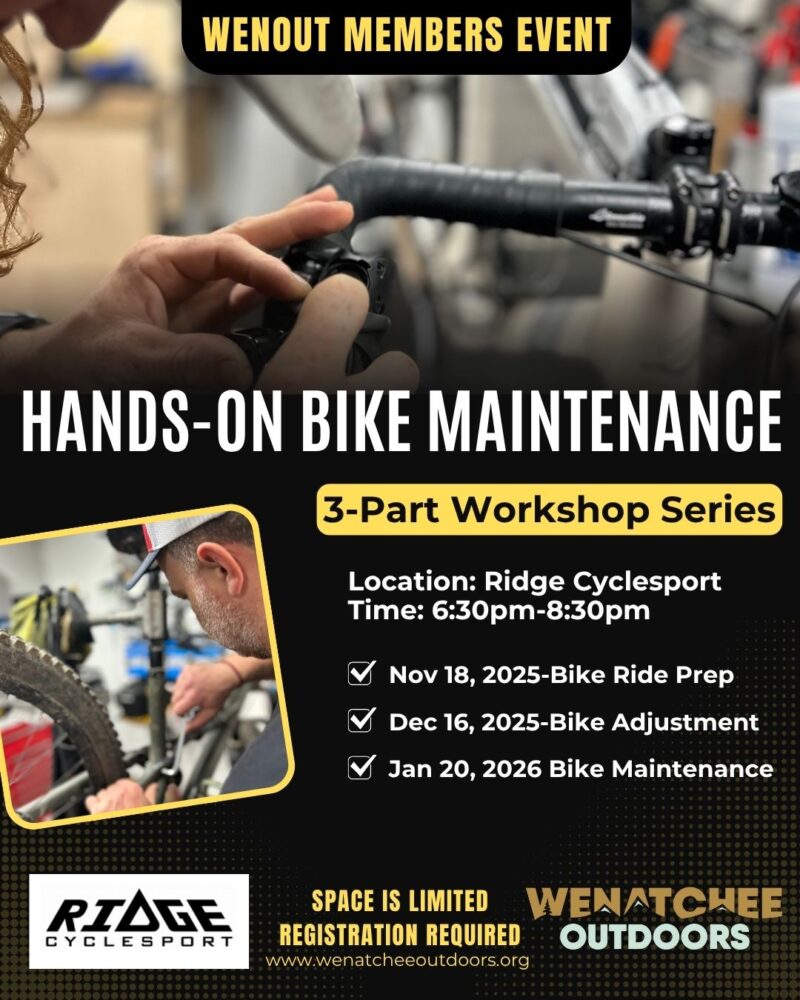 Wenatchee Outdoors and Ridge Cyclesports are partnering to offer WenOut members a Hands-On Bike Maintenance 3-part Workshop Series, led by instructors Phil Cibicki, Evan Plews, and Connor Barrows. The sessions will take place on November 18, December 16, and January 20 from 6:30-8:30pm. >>>>REGISTRATION REQUIRED<<<< Scroll to the bottom to RSVP. Space is limited. Note: Only sign up if you can attend all classes. Individual Class Descriptions Class 1- November 18, 2025 6:30-8:30pm Bike Ride Prep: Readying your bike for […]